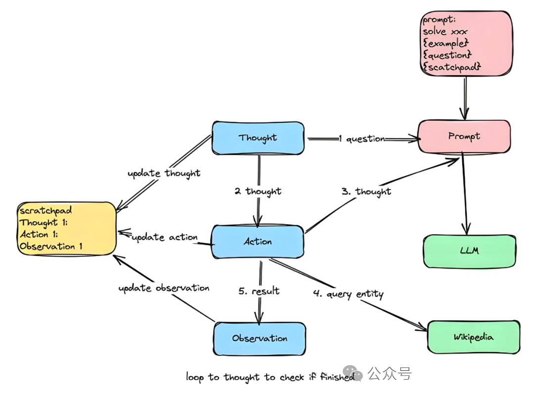 ReAct 提供了一种更易于人类理解、诊断和控制的决策和推理过程。它的典型流程如下图所示,可以用一个有趣的循环来描述:思考(Thought)→行动(Action)→观察(0bservation),简称TAO循环。