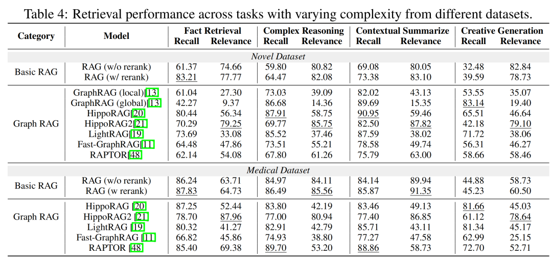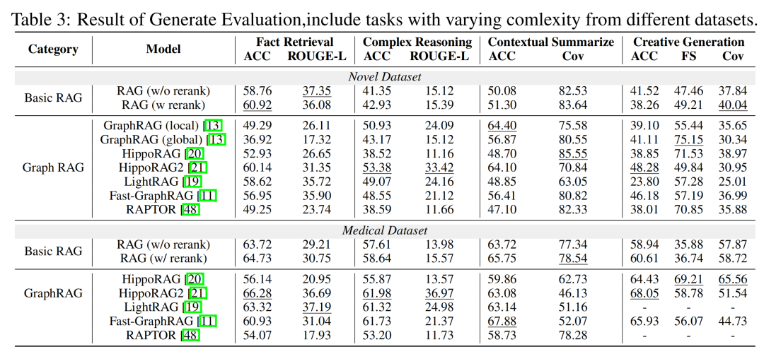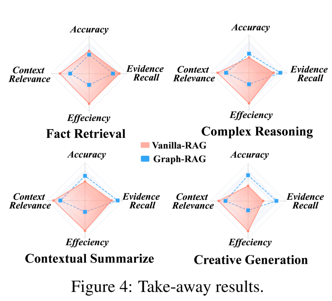- 生成准确性: 基本RAG在简单事实检索任务中表现优于GraphRAG,但在复杂推理、上下文摘要和创造性生成任务中,GraphRAG表现出明显优势。