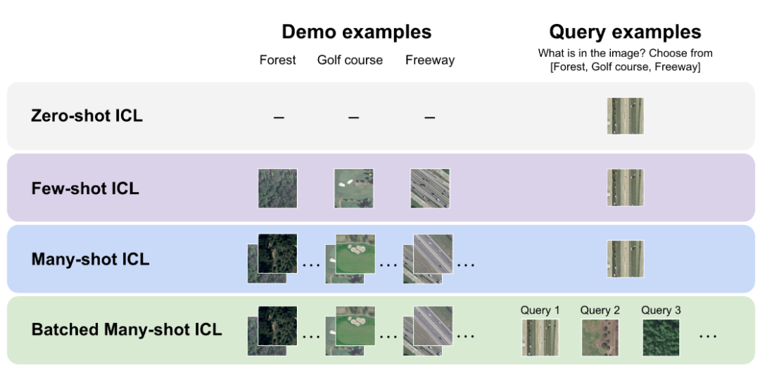 图1|这张图展示了模型在不同“示例量”下的工作方式:Zero-shot:模型完全没有看到示例,直接回答。Few-shot:上下文里只有极少量示范。Many-shot:一次输入大量示例,让模型在推理前“快速补一节课”。Batched many-shot:把多个查询一起塞进同一大 prompt,让模型同时参考大量示例并批量回答。随着示例数量的增加,模型的表现不断提升,也让 many-shot ICL 成为一种轻量但强大的任务适配方式