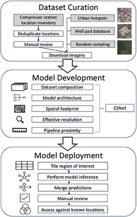 作者使用公开的高分辨率卫星影像,并构建了一个端到端的检测模型,用于识别大片区域中的井场及其附属设施。技术上,这项研究体现了三个关键价值点: