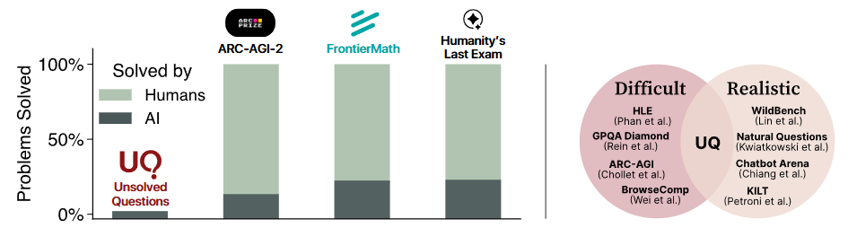 图2|左图展示了一个核心问题:许多现有 benchmark 测试的都是“人类早已解决”的老问题,无法真正推动前沿模型的进步。而 UQ 则专注于那些仍待攻克的、开放式的高难度问题,更贴近真实世界的需求。右图强调了传统评测的矛盾——越难的题越不现实、越现实的题又不够难——而 UQ 正是在解决这种“难度与真实度的拉扯”中诞生的新范式