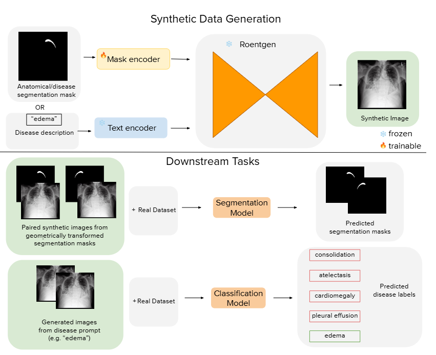 图4|合成数据生成与下游任务提升的整体流程:研究团队利用扩散模型结构(基于 ControlNet)从文本提示或结构化掩码中生成一批高质量的合成图像,这些图像随后被加入到原始训练集中,用于进一步提升模型在分类或分割等任务上的表现。整体流程本质上是一条“生成 → 增强 → 训练”的数据管线,用生成模型为下游学习注入更多有效样本,从而提高模型对结构与语义的理解能力