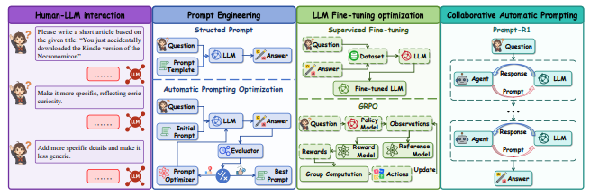 本图用四格漫画式对比把“人类-LLM直接对话、传统提示工程、监督微调、以及本文Prompt-R1”四种范式放在同一画面:左上角是人类凭经验手写提示,碎片化且低效;右上角是自动提示优化(APO),用算法在句子层面做搜索,仍把LLM当静态黑箱;左下角是监督微调(SFT),需要大量标注且模型参数被锁定;右下角给出Prompt-R1,把小型LLM训练成会“自己思考-自己提问”的智能体,与任意大型LLM进行多轮对话,像教练带选手一样实时引导推理,全程用强化学习端到端更新,既不用改大模型参数,也不依赖人工提示,形成资源节省、即插即用、任务通用的协作闭环。