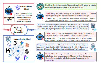 本文提出 Prompt-R1,一种端到端强化学习框架,把小型 LLM 训练成“提示智能体”,与任意大型 LLM 进行多轮对话式协作:小型模型在每一轮先内部思考,再输出一段自然语言提示;大型模型仅作为黑箱环境返回回答,双方历史被完整保留并作为下一轮状态。整个轨迹用“格式-答案”双约束奖励同时监督中间提示是否合规、最终答案是否正确,采用 GRPO 强化学习算法直接对小型模型做 token 级策略更新,无需梯度回传至大型模型。训练完成后,小型模型可即插即用地搭配不同大型模型推理,实现零额外成本、跨任务泛化的自动提示优化。