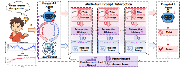 - 设计了一种双约束奖励机制,同时优化正确性、生成质量和推理准确性。这种奖励机制确保了整个交互过程中提示的质量和最终答案的准确性。