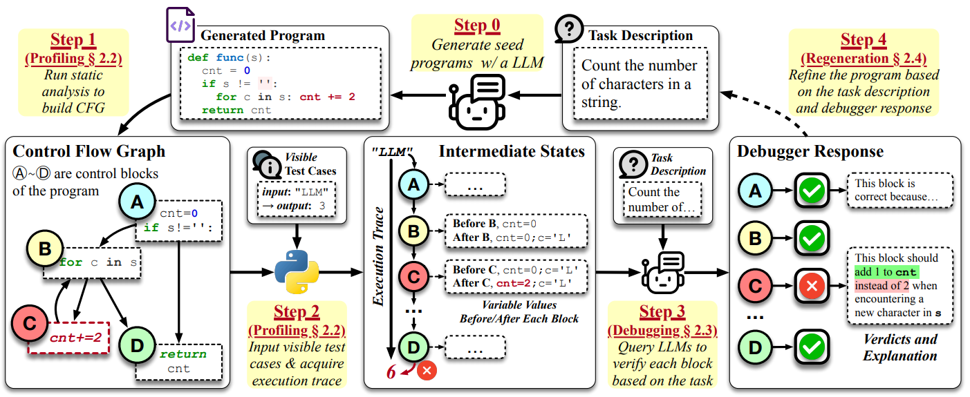 现有方法将程序视为不可分割的整体,依赖执行后的反馈进行调试(比如只告诉你“这个测试没过”)。