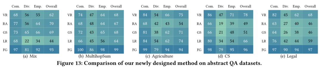 选择5种代表性方法(VanillaRAG、RAPTOR、GGraphRAG、HLightRAG、FastGraphRAG),在5个抽象QA数据集上采用“头对头胜率”评估(用GPT-4o从全面性、多样性、启发性、整体表现四个维度打分),结果如图6-10所示。