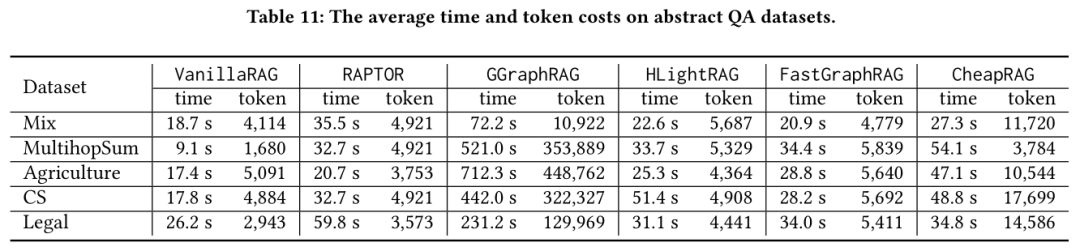 - 均衡实用型:RAPTOR与HippoRAG,时间成本与VanillaRAG接近(RAPTOR平均1.36-3.18秒/查询),token消耗仅略高(RAPTOR 757.6-4140.7 token/查询),这是因为它们的检索逻辑与VanillaRAG相似,仅增加了高层摘要或实体关系的筛选;