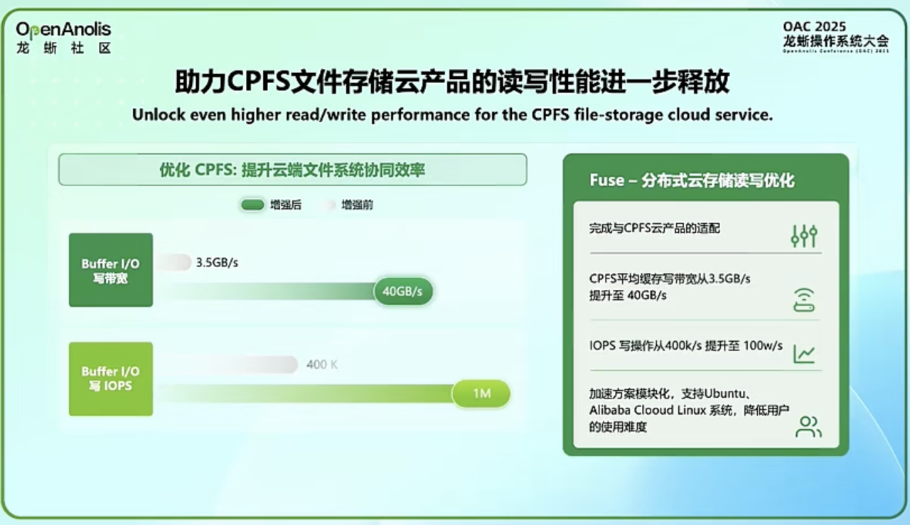 例如,龙蜥操作系统(OpenAnolis)给出的方案是全链路的“疏通”:针对 CPFS(并行文件系统),龙蜥在 OS 层面进行了深度适配。缓存写场景下的性能可以直接提升 10 倍。这意味着模型训练中的 Checkpoint 保存时间大幅缩短:以前需要几小时,现在几十分钟就能搞定。