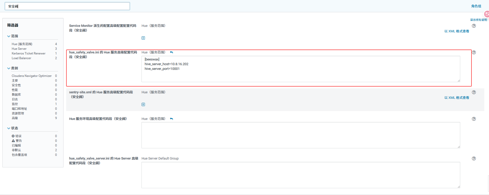 找到 Hue Service Advanced Configuration Snippet (Safety Valve) for hue_safety_valve.ini。