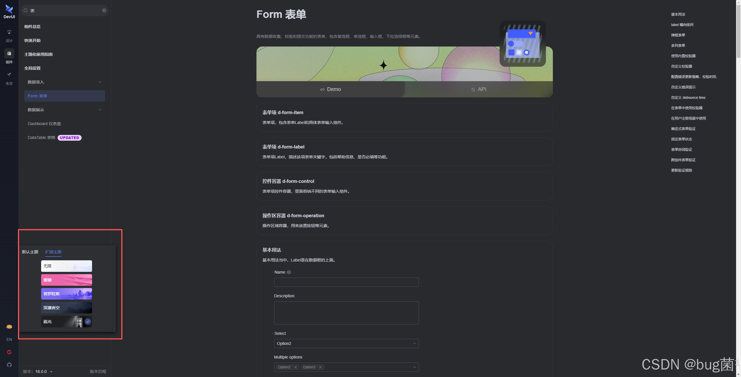 只需在项目的根节点引入 DevUI 的主题包,并切换 CSS 类名或属性即可实现一键换肤。