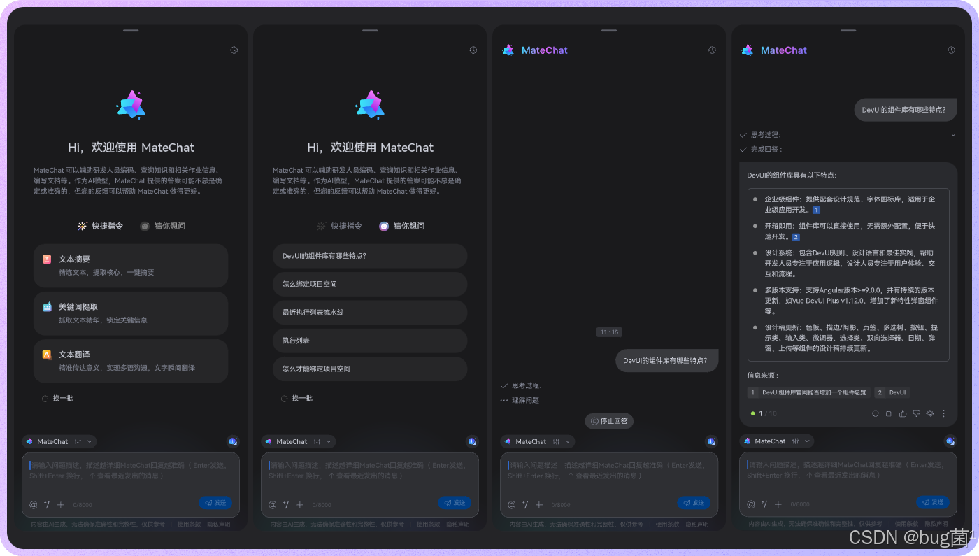 - 知识检索增强:通过配置 MateChat,它可以索引你的项目文档(比如 DevUI 的私有业务组件文档)。当你询问“如何使用内部的资源选择器组件?”时,MateChat 不是在瞎编,而是基于检索到的 Markdown 文档回答。