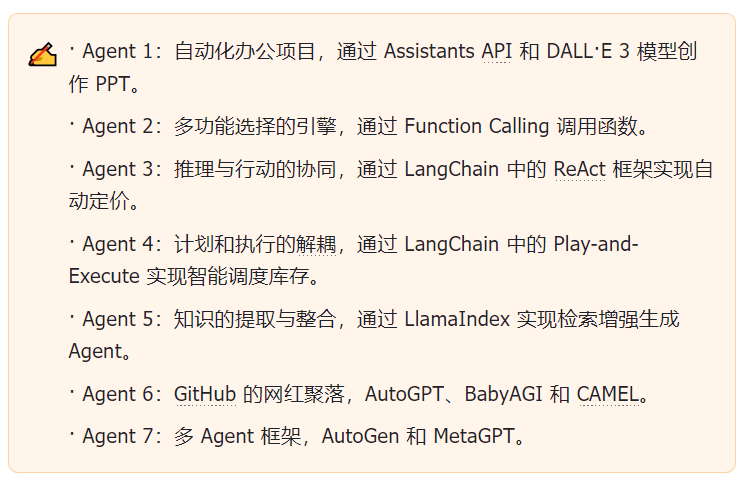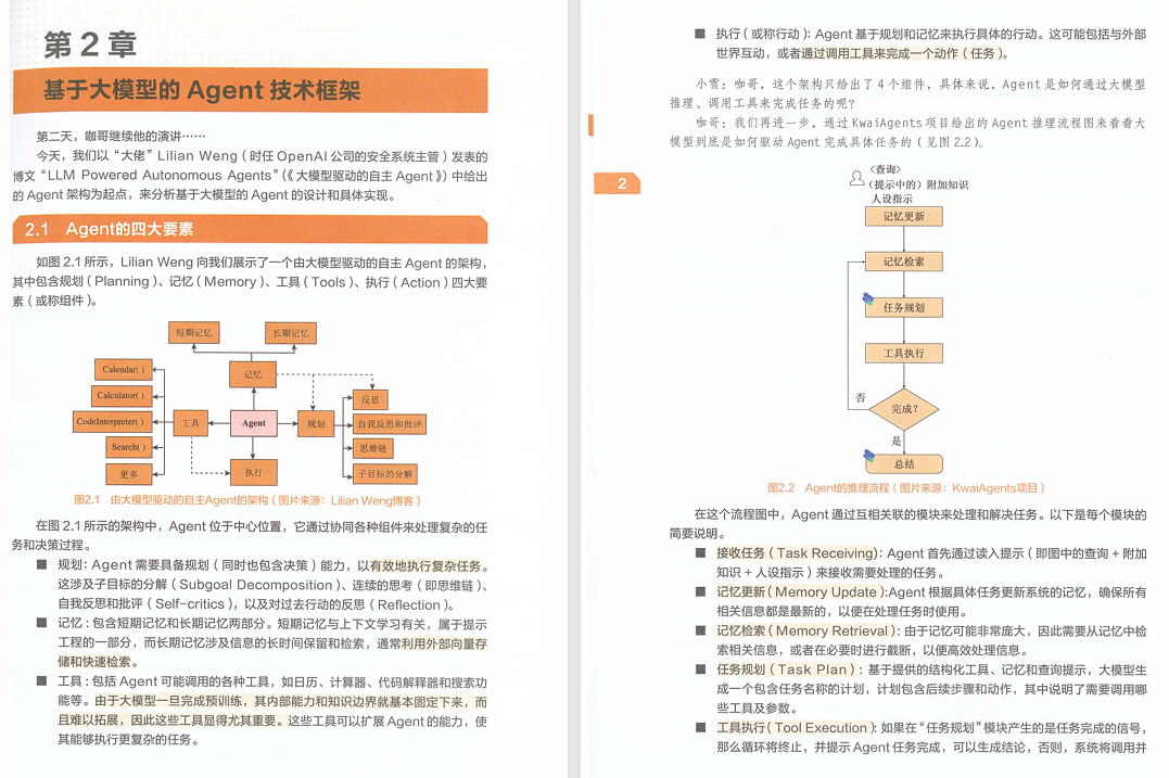 书中介绍了 Agent 架构的四大要素,分别是规划、记忆、工具、执行。重点介绍了当前流行的ReAct框架。详细说明了以下技术工具的使用方法。