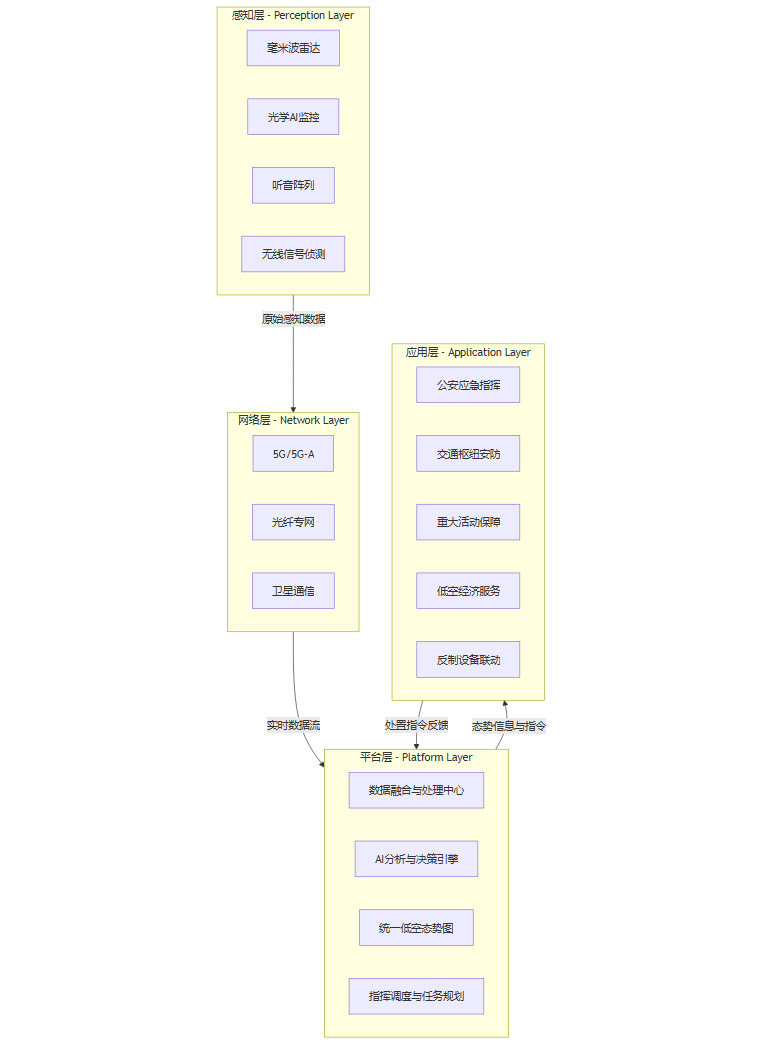 一个典型的城市级低空安防网架构,其逻辑关系可以用下图清晰地展示。
