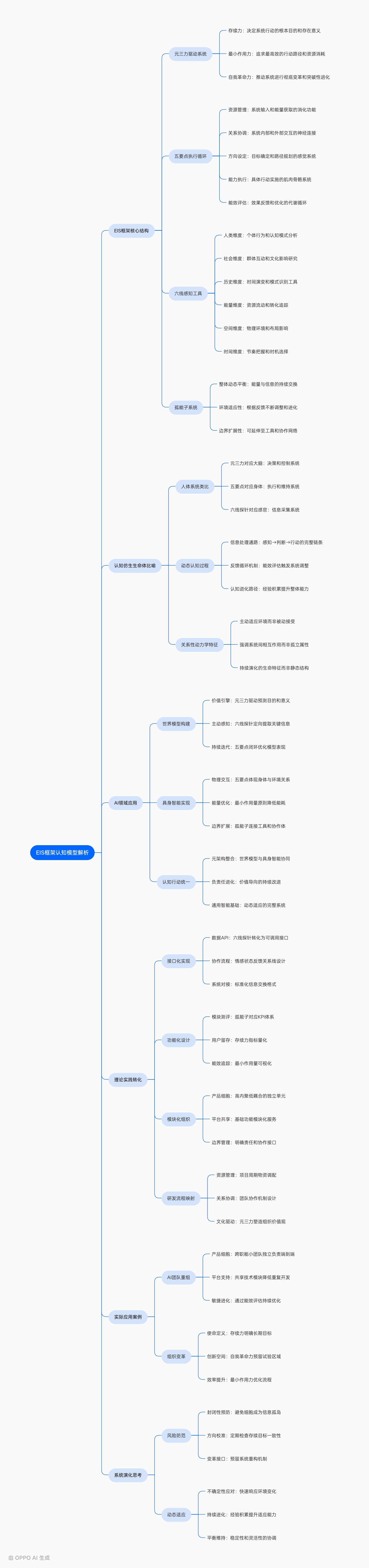 总结上下文文档(主要源自文档1)介绍了EIS框架(一个认知模型),将其比喻为“认知仿生生命体”,模仿智能生命体的动态过程。该框架包括元三力(存续、最小作用、自我革命)作为驱动核心、五要点循环(资源、关系、方向、能力、能效)作为执行模块、六线探针(人、社会、历史、能量、空间、时间)作为感知工具,以及孤能子作为整体系统。其核心价值在于统一认知与行动,优化反馈循环,促进进化,特别被应用于AI领域的“世界