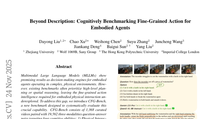 在具身智能(Embodied AI)领域,我们长期面对一个核心挑战,即如何让机器真正理解物理世界的动态交互。当前的多模态大模型(MLLMs)在内容识别上取得了显著进展。它们可以轻易地为一个视频片段打上标签,例如“一个人正在切西瓜”。这种能力,本质上是一种分类或描述任务。它回答了“是什么”的问题,却在更深层次的认知维度上显得力不从心。