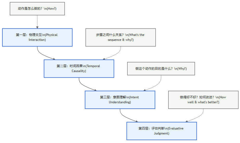CFG-Bench最核心的创新,是它建立了一套模拟人类认知过程的四层递进式框架。这四层从具体到抽象,系统性地覆盖了动作理解的全部维度。