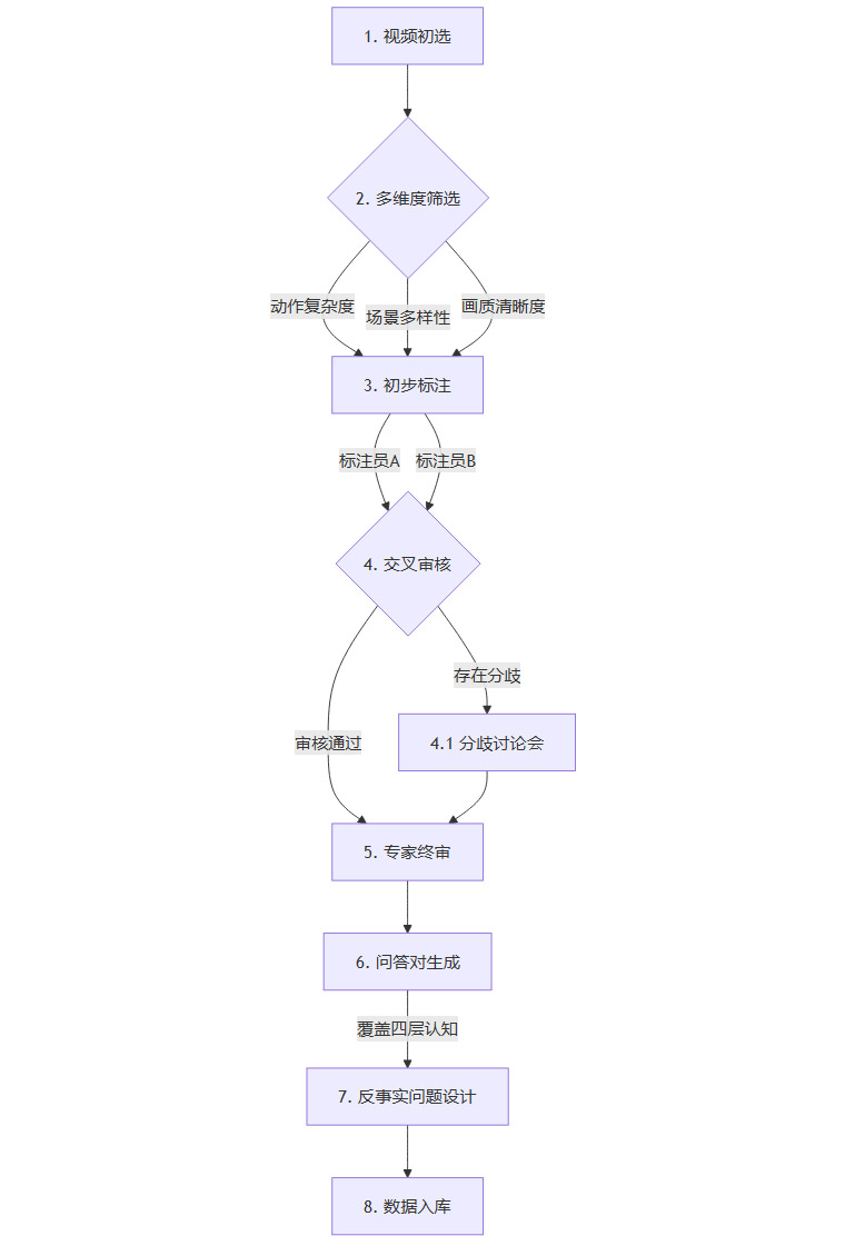 交叉审核机制:每个视频由至少两位标注员独立进行标注和问答设计。如果两者结果不一致,将进入分歧讨论环节,由更高级别的专家进行仲裁,确保标注的客观性和一致性。