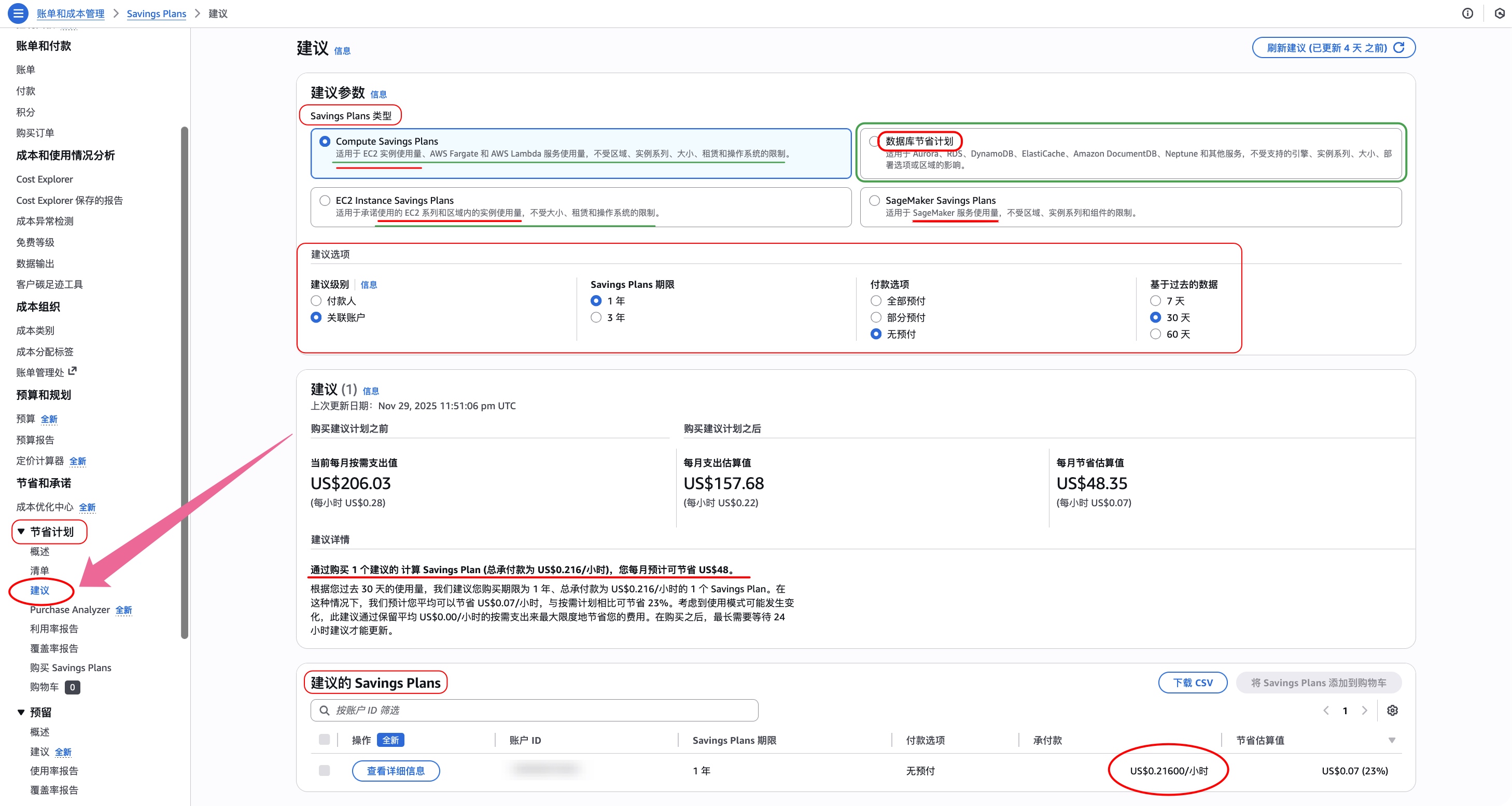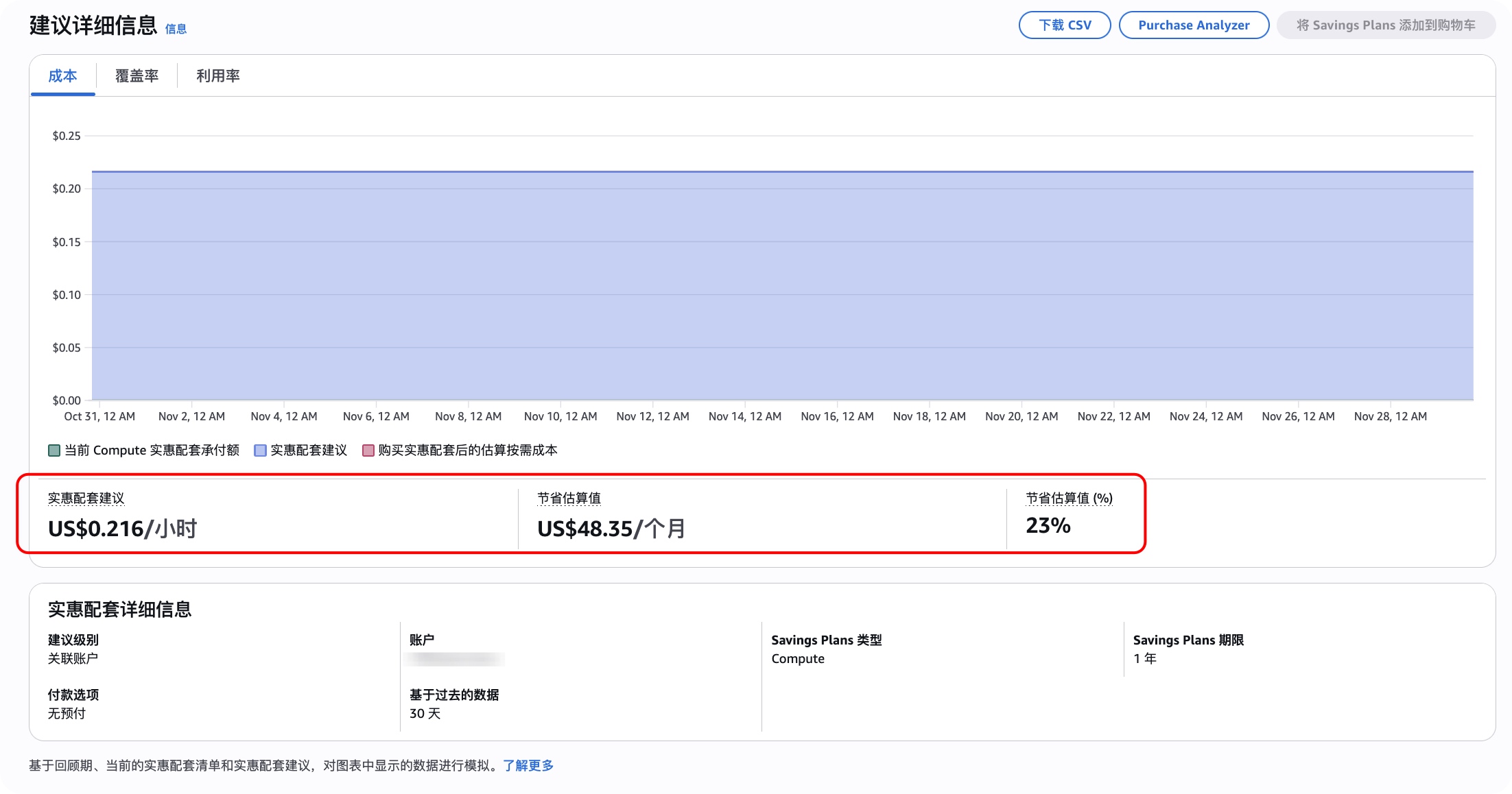 可以访问建议页面,查看 AWS 建议的节省计划,以帮助您在符合资格的使用量上实现节省。这些建议可以随时更新,以便您轻松购买最佳节省计划来帮助您节省成本。