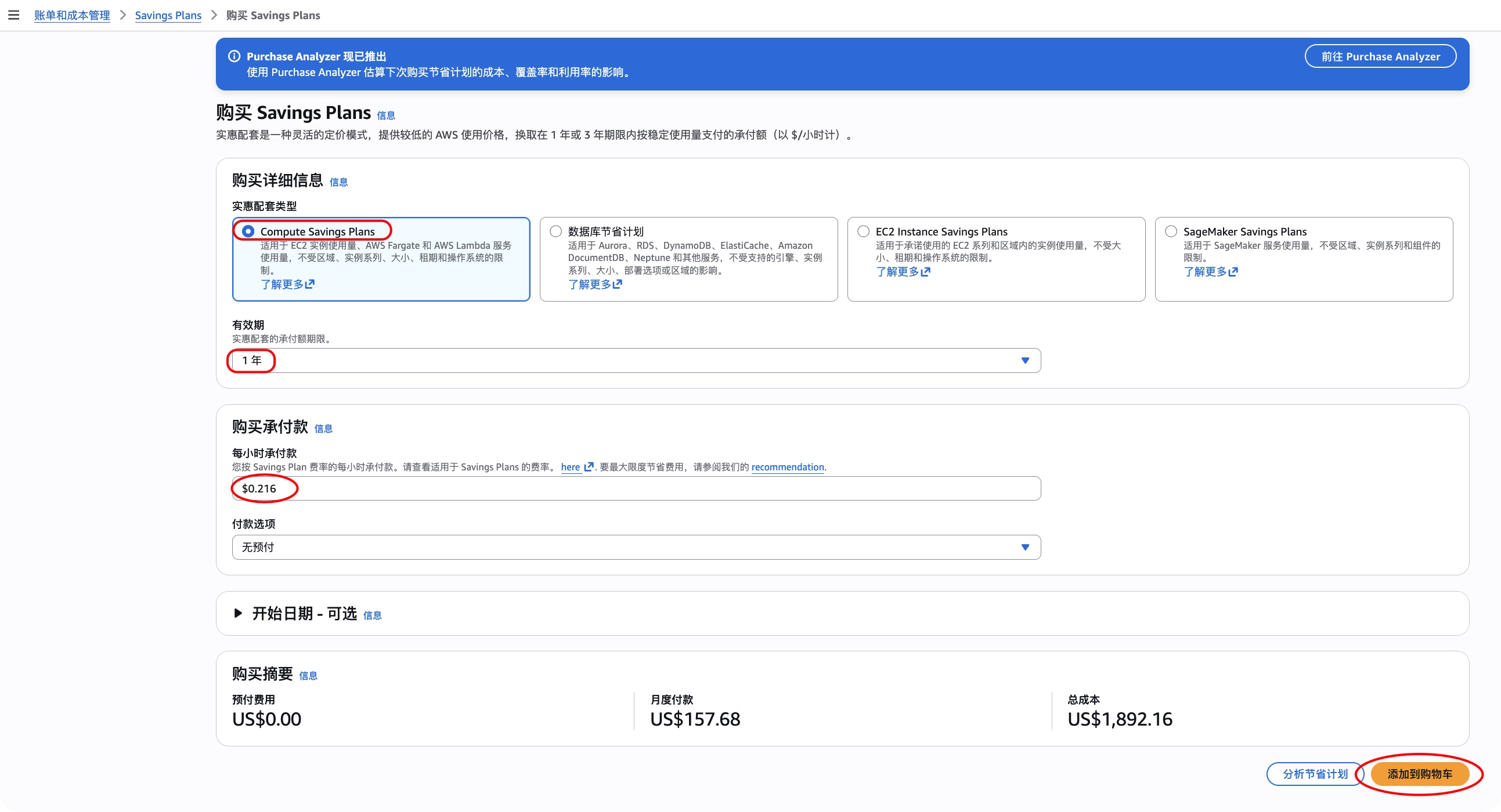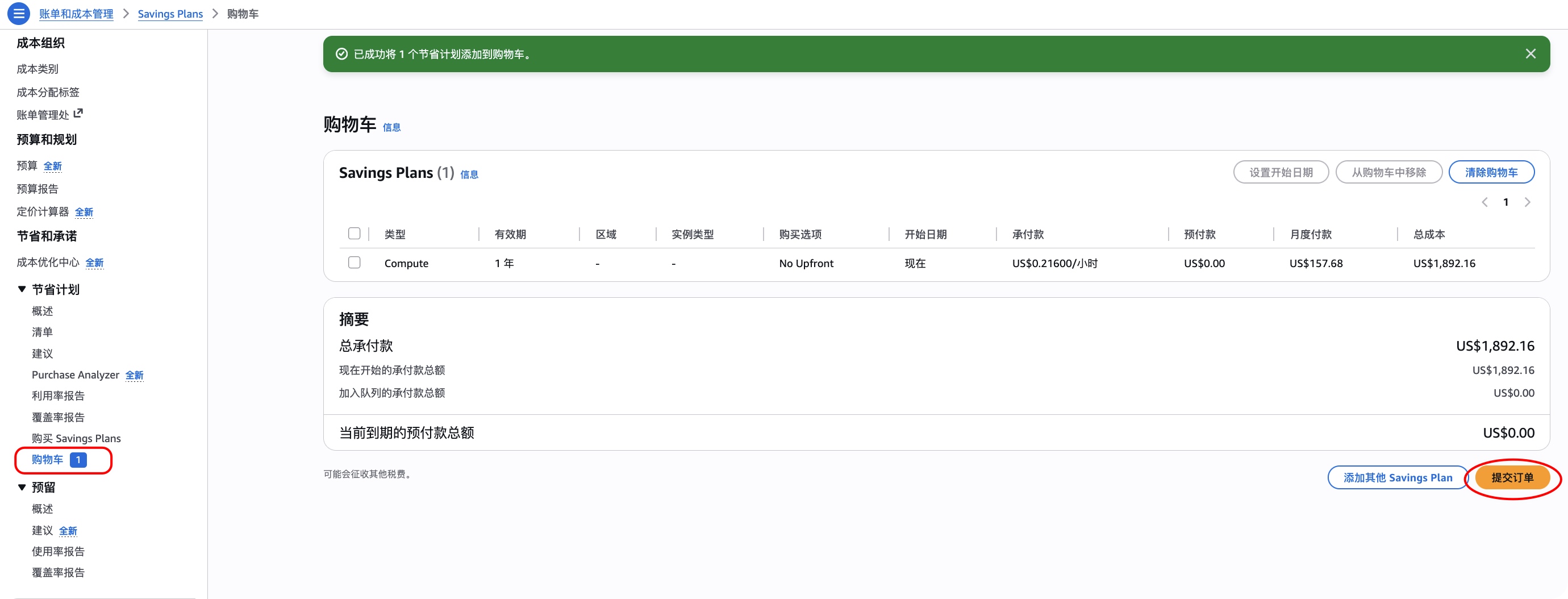 节省计划购物车页面会保留您的承诺,直到准备好购买为止。