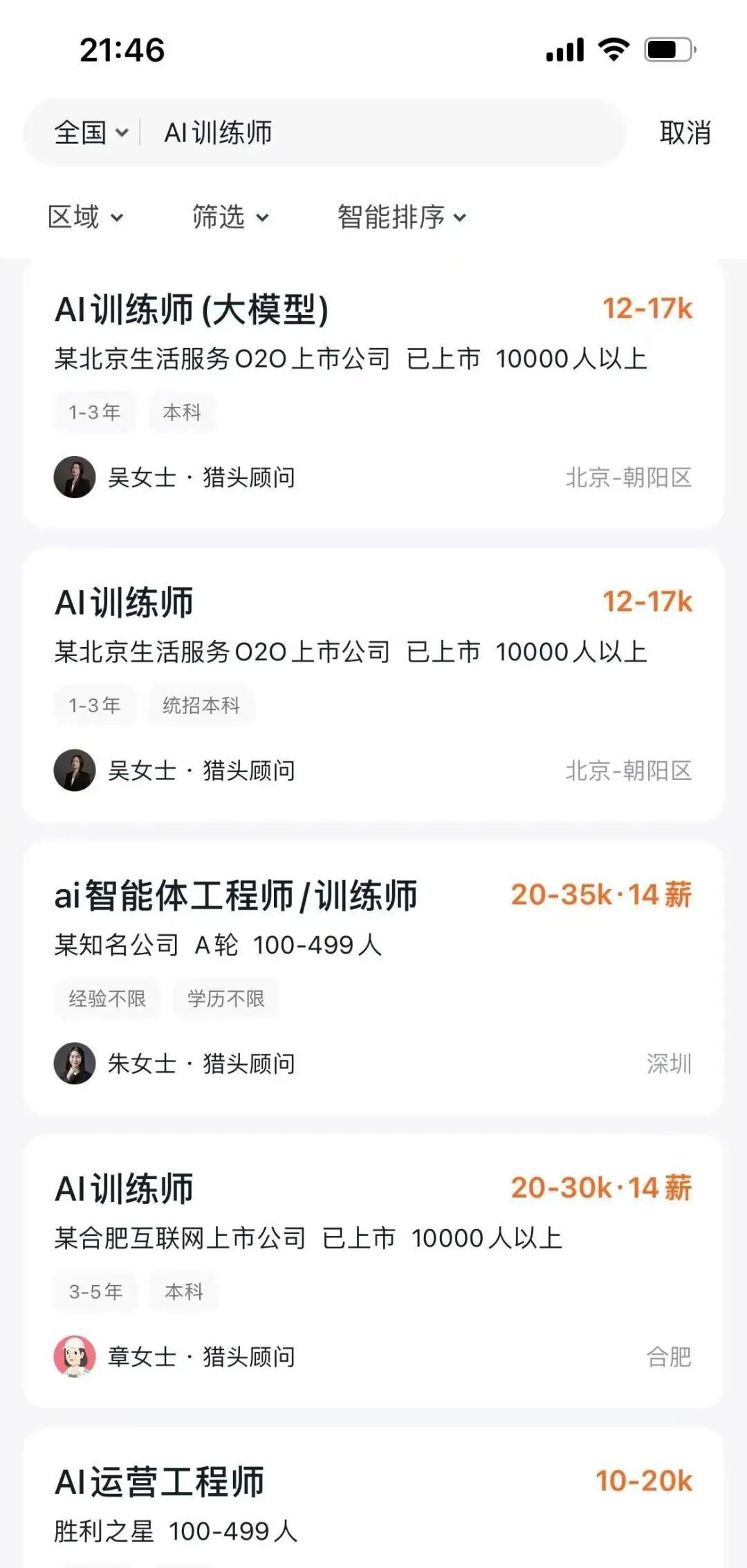 新岗位:第一批已经转岗的文科生,已经转到了AI训练师、AI产品经理岗位…不需要你有技术,甚至一些专科学历的互联网从业人员,已经提前嗅到了机会,顺利转岗到了这些岗位。