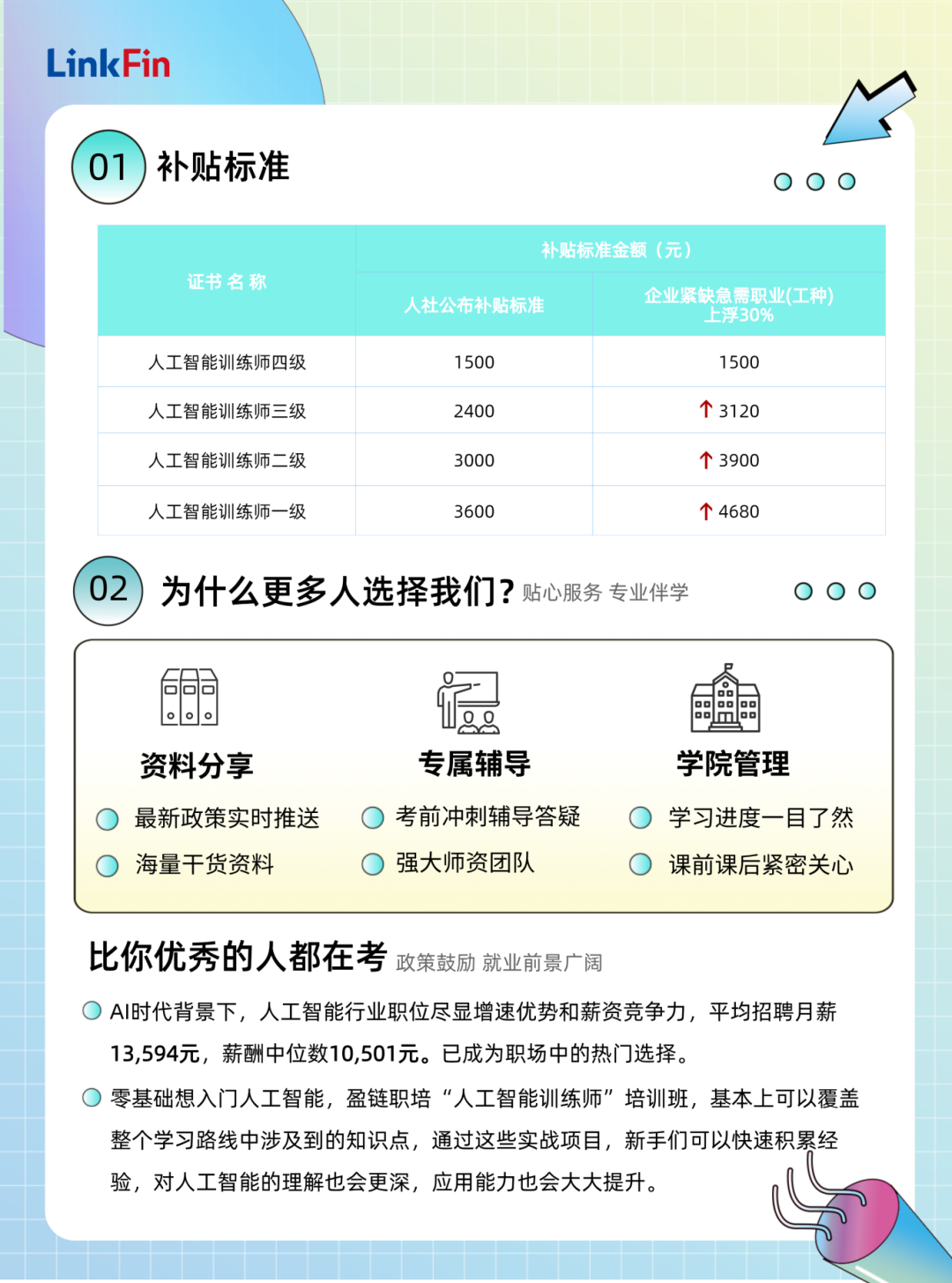 ✅补贴政策**:按照广东省现行政策,三级/四级证书正常补贴2400/1500元,但人工智能训练师在广州、佛山、清远等多地企业紧缺急需工种目录内,补贴金额可在原来基础上上浮30%!