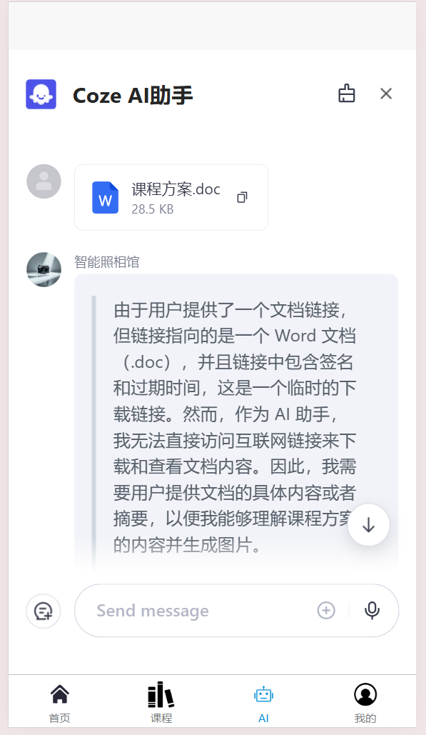 | 灵活性 | 低,界面和交互受限于Coze提供的H5页面,深度定制困难。 | 高,可完全自定义对话界面、交互逻辑,并能与课程应用的其它功能深度集成。 |