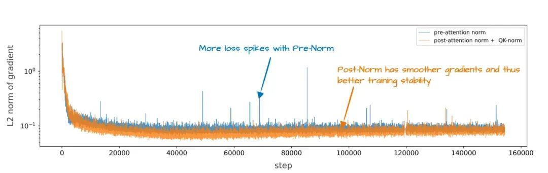 遗憾的是,该图同时展示了规范化层重新排序和 QK-Norm 的结果,因此难以判断规范化层重新排序单独的贡献。