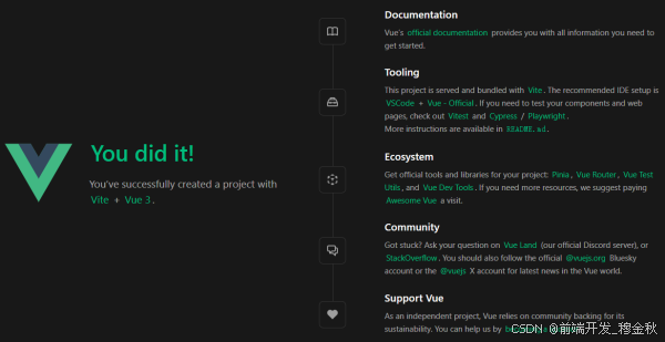 ✅ 你应该看到 Vue 官方欢迎页面,带有 Vue logo、路由链接、Pinia 状态等。