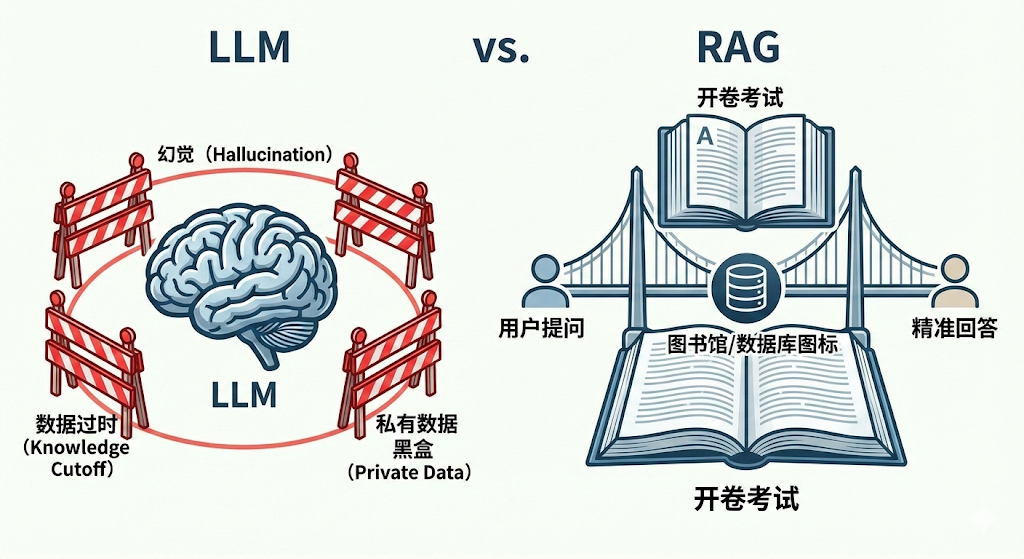 为了解决上述问题——即在保持生成能力的同时,实现知识的准确性、实时性和私有性,检索增强生成(Retrieval-Augmented Generation, RAG)应运而生。RAG并非单一的算法,而是一种将参数化记忆(LLM的权重)与非参数化记忆(外部知识库)相结合的系统架构。它通过在生成过程中动态检索相关的外部信息,实现了从“封闭书本考试”向“开卷考试”的认知范式转变。