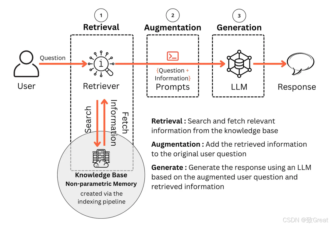 知识库:为 RAG 应用程序创建的非参数内存。它包含来自各种预定来源的信息,这些信息经过处理并存储在持久内存中