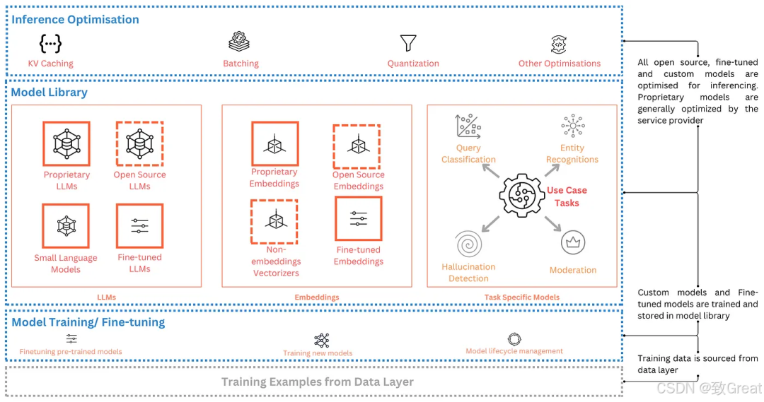 基础模型:预先训练的大型语言模型,这些模型已在海量数据上进行训练。一些 LLM 开发人员将模型权重公开,以促进协作和社区驱动的创新,而另一些开发人员则将模型保持封闭,以提供支持、托管服务和更好的用户体验