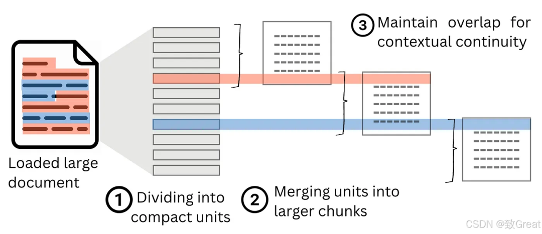 从小到大分块:一种分层分块方法,首先将文本分解为非常小的单元(例如句子、段落),然后将小块合并为较大的块,直到达到块大小。滑动窗口分块使用块之间的重叠来保持跨块边界的上下文。
