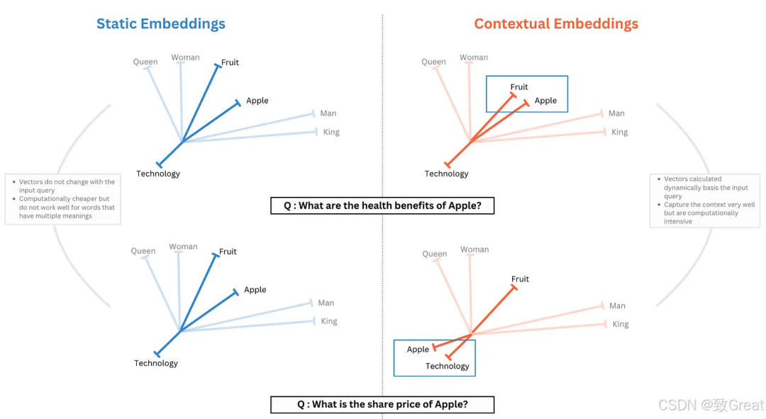 上下文嵌入:上下文嵌入由 BERT 或 OpenAI 的文本嵌入等模型生成,可为查询和文档生成高维、上下文感知的表示。这些基于转换器的模型可捕获深层语义含义和关系。例如,关于“苹果”的查询将根据输入查询检索讨论苹果水果或苹果科技公司的文档。