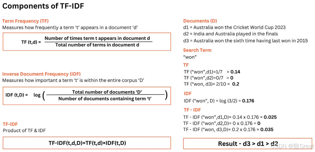 TF-IDF:词频-逆文档频率是一种统计方法,用于评估文档中单词相对于文档集合(语料库)的重要性。它为文档中出现频率高但在语料库中出现频率低的单词分配更高的权重。