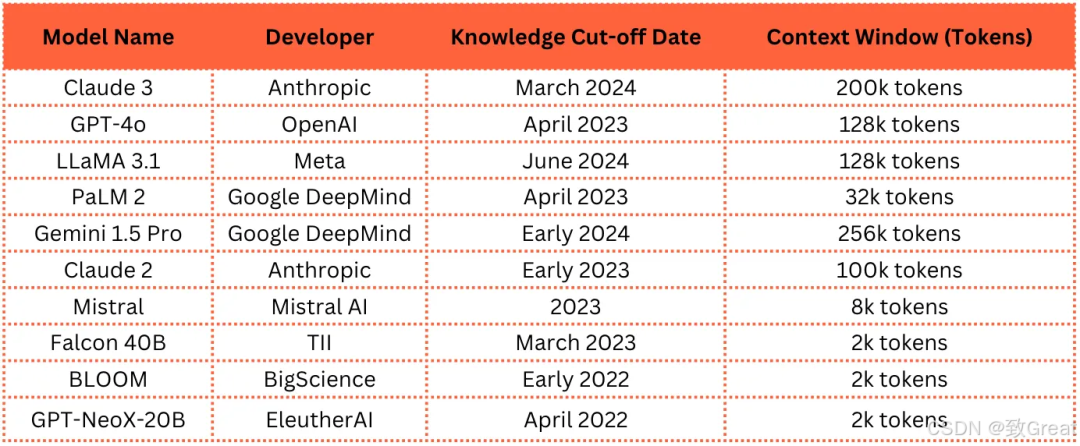 知识截止日期:训练 LLM 是一个昂贵且耗时的过程。训练 LLM 需要大量数据,并且需要数周甚至数月的时间。因此,训练 LLM 所用的数据不是最新的。例如,GPT-4o 仅拥有截至 2023 年 10 月的知识。此知识截止日期之后发生的任何事件均不适用于模型。