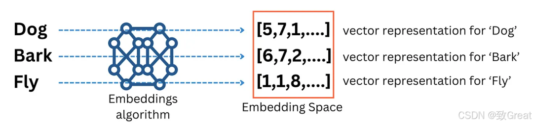 嵌入:计算机的核心是进行数学计算。数学计算是基于数字进行的。因此,计算机要处理任何类型的非数字数据(如文本或图像),必须先将其转换为数字形式。嵌入是一种对 RAG 非常有用的设计模式。嵌入是数据的矢量表示。一般来说,嵌入是已转换为 n 维矩阵的数据。词嵌入是单词的矢量表示。