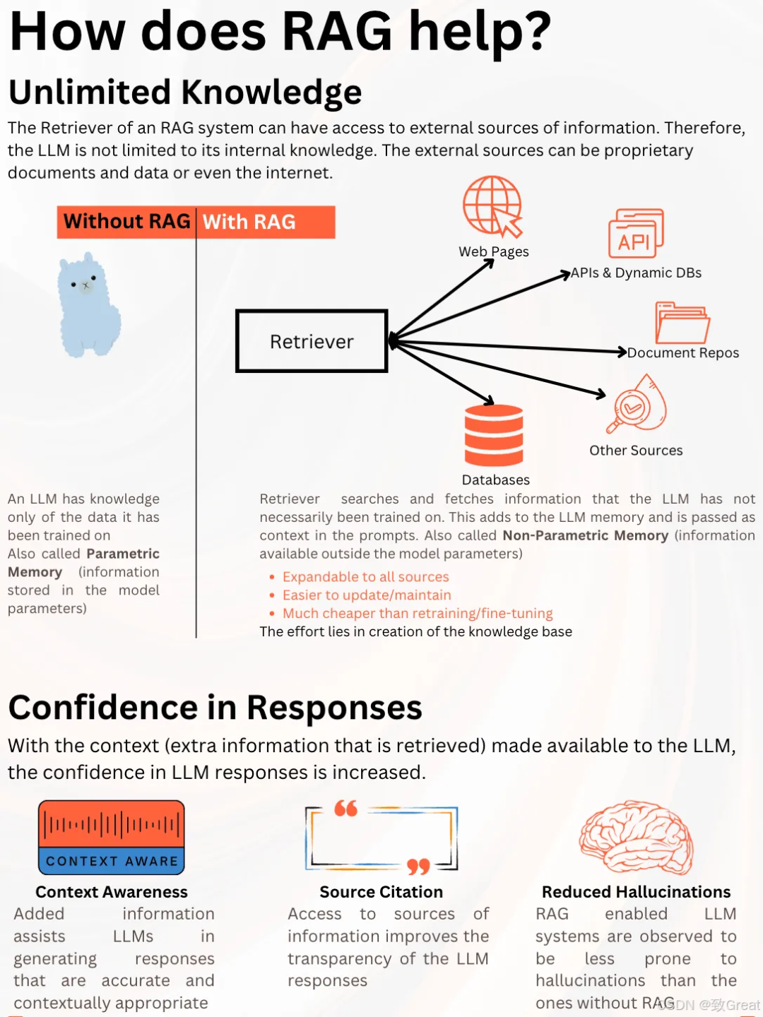 非参数记忆:LLM 在其内部参数中没有但可以通过外部检索机制(如搜索引擎或数据库)访问的信息。RAG 为 LLM 提供了访问此非参数记忆的权限。