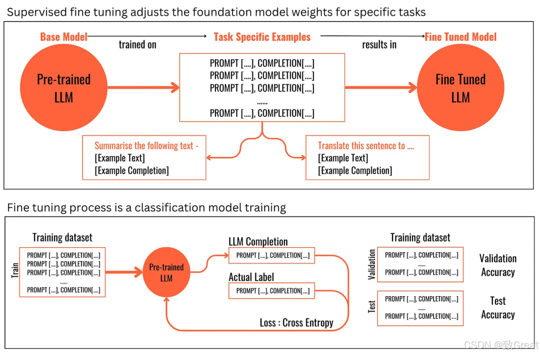 **监督式微调 (SFT)**:监督式微调是一种用于调整预训练语言模型以适应特定任务或行为(如问答或聊天)的过程。它涉及在标记数据集上进一步训练预训练的基础模型,其中模型学习将输入映射到特定的期望输出。