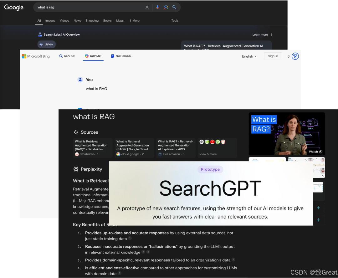 搜索引擎: 传统的搜索结果以按相关性排序的页面链接列表显示。最近,Google Search、Perplexity 和 Google Search 都使用 RAG 以自然语言呈现连贯的文本,并附有来源引文。事实上,搜索引擎公司现在正在构建 LLM 优先搜索引擎,其中 RAG 是算法的基石。