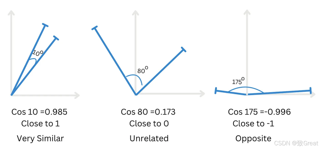 余弦相似度:嵌入之所以流行是因为它们有助于建立单词、短语和文档之间的语义关系。余弦相似度计算为两个向量之间角度的余弦值。平行线的余弦,即角度=0 为 1,直角的余弦,即 90 为 0。另一方面,对边的余弦,即角度=180 为 -1。因此,余弦相似度介于 -1 和 1 之间,其中不相关的术语的值接近于 0,而相关术语的值接近于 1。