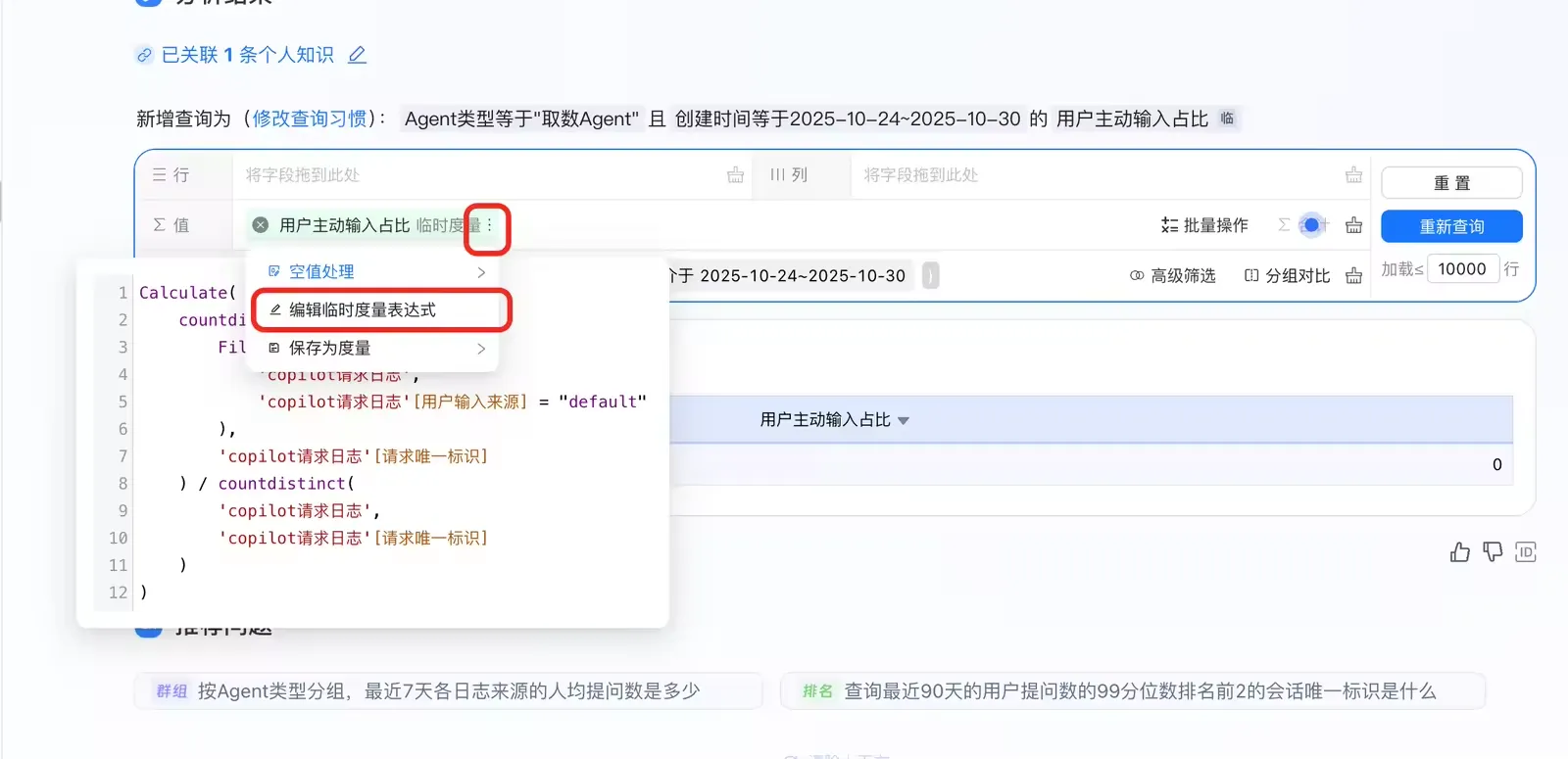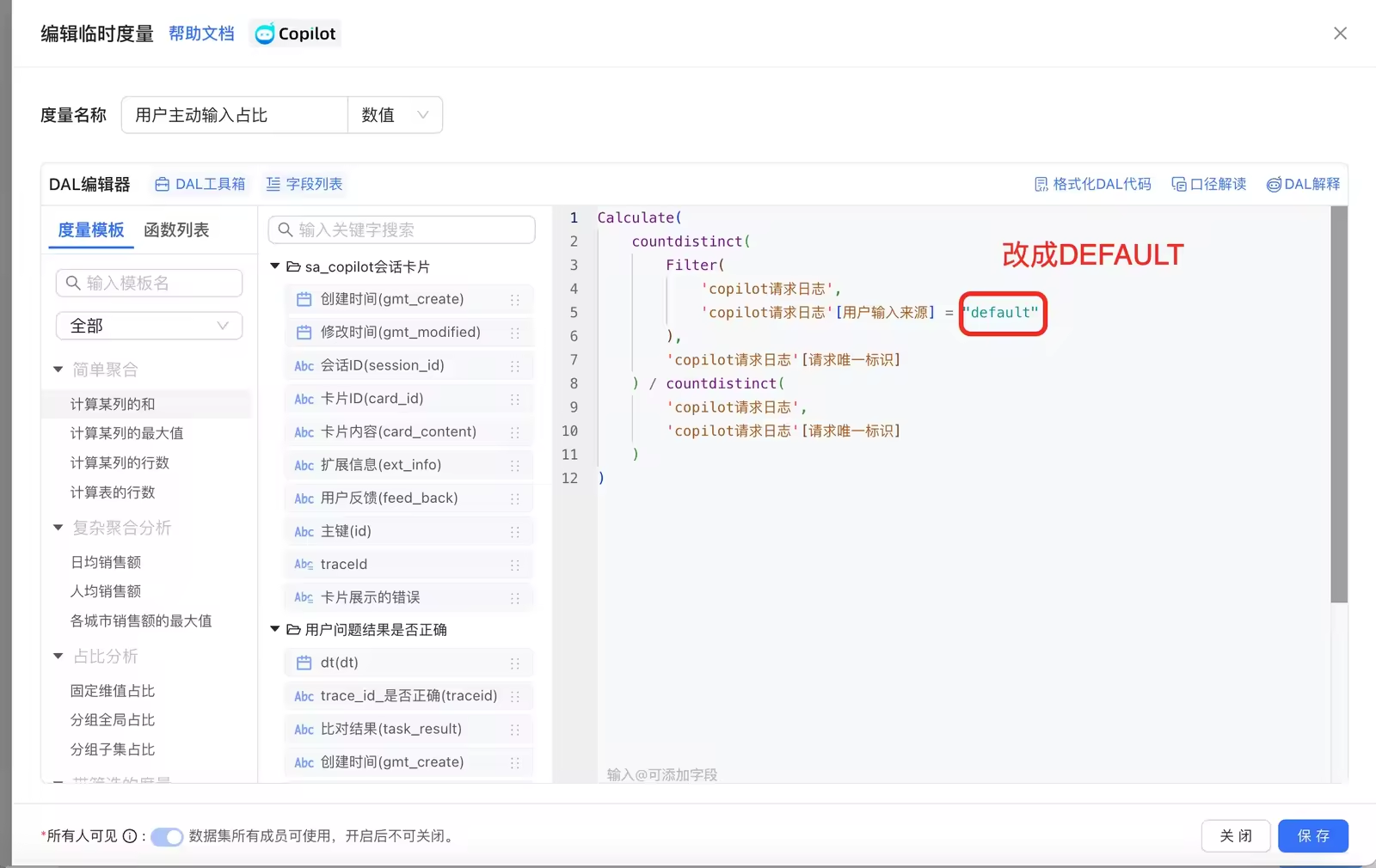 上面这个案例里面,度量生成的有点小问题,用户输入来源是“default”,实际上是“DEFAULT”,那么这里最快的方式就是修改这个度量。