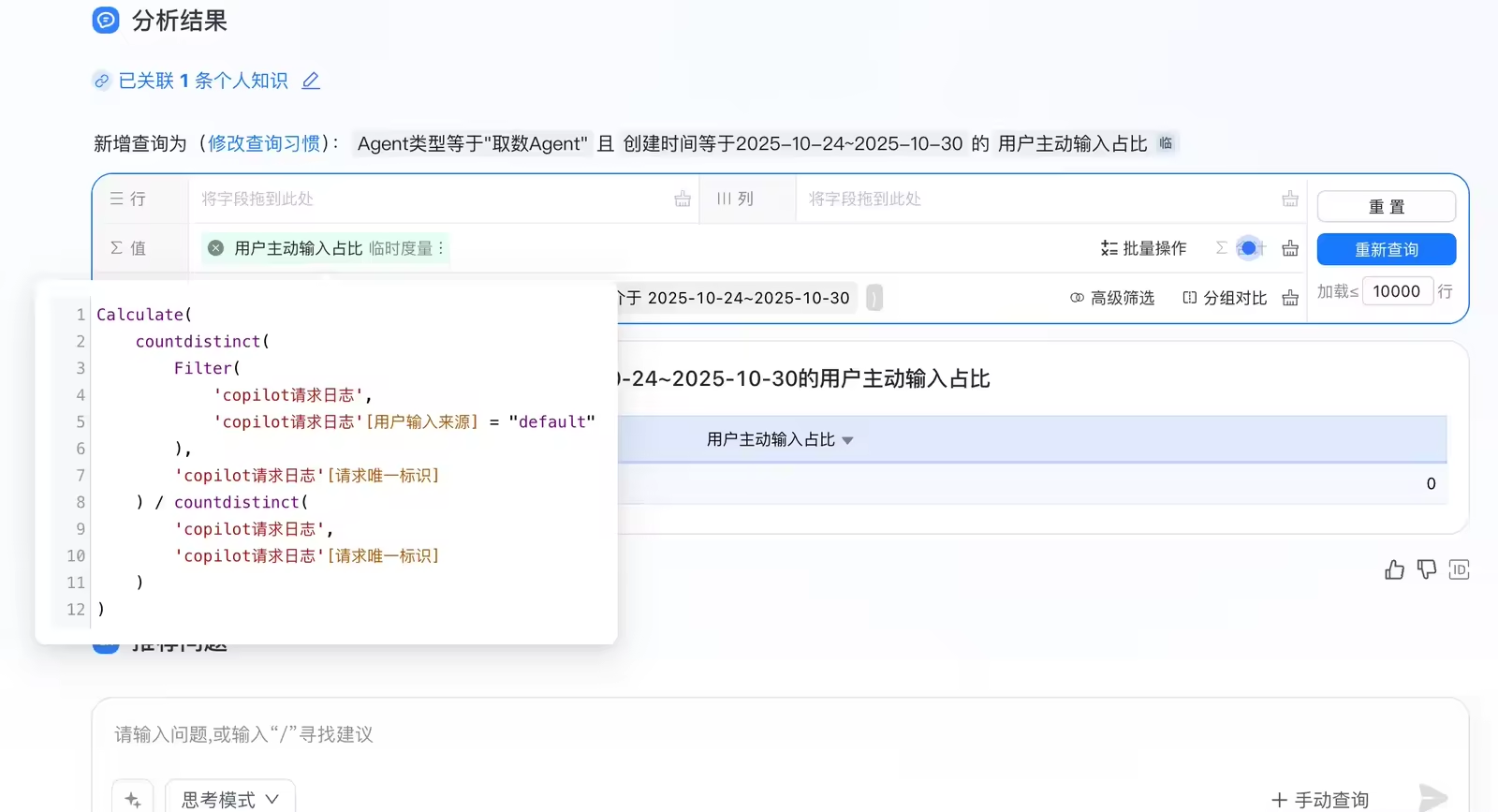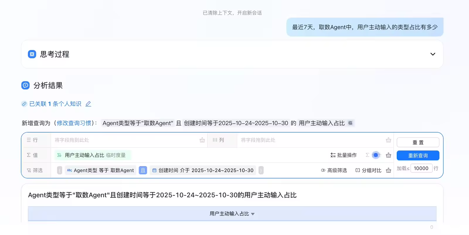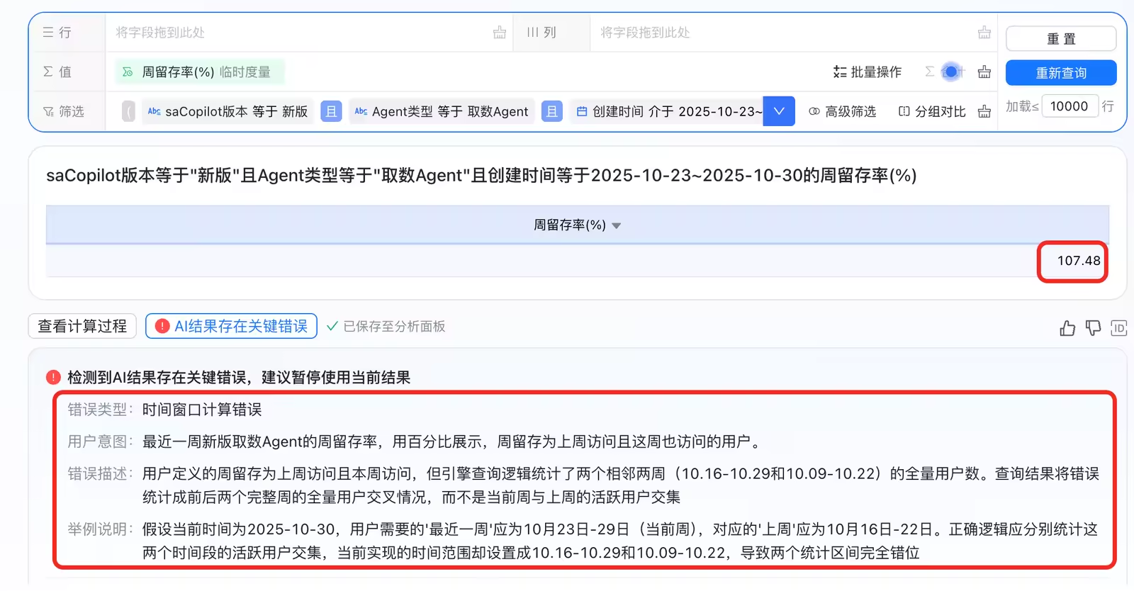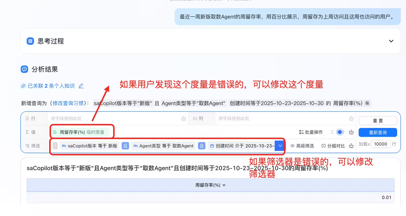 - 提问有歧义,比较常见的是时间选择,一个表里面很有可能有分区日期、创建日期等。那我在这里问“昨天的取数Agent UV数是多少,相比上周同期增长多少”,那模型也不知道这里的“昨天”是指创建日期还是分区日期。解决这个问题的办法一般是用知识进行约束,给这张表维护一个知识:“时间过滤请使用创建时间”,这样大模型就知道如何进行选择了。除了日期还有一些相似的度量都会导致模型出现“选择困难症”。这些问题我们人类解决都是“钉钉”对话进行询问。