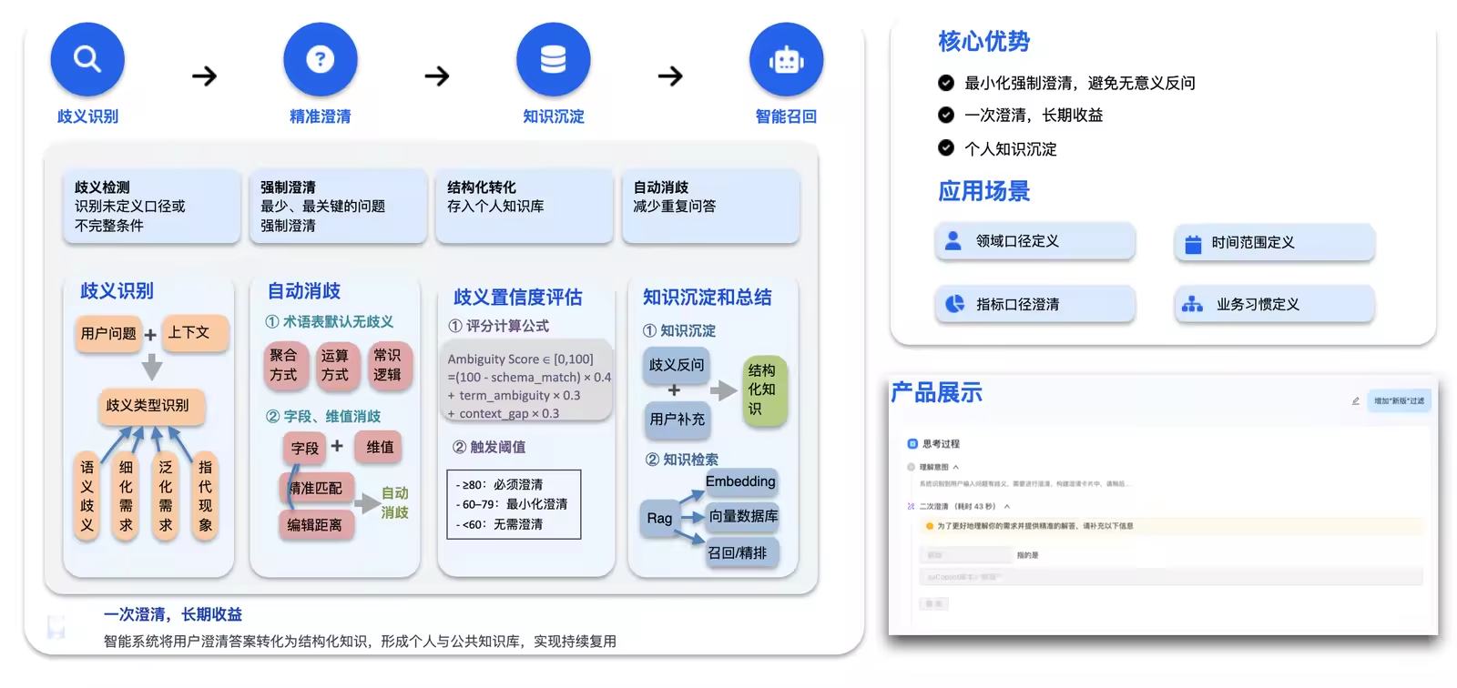 另外,这里对齐信息不是每次都要重复,系统会把这些信息存储在知识库中,下次用户提问的时候,如果在知识库中已经有这条知识,就不会触发反问澄清。这个机制也跟我们人类信息对齐是类似的,我们不需要每次都回到原点对齐信息。也就意味着,当我们不断使用的过程就是不断补齐知识,后续使用就会越来越方便。