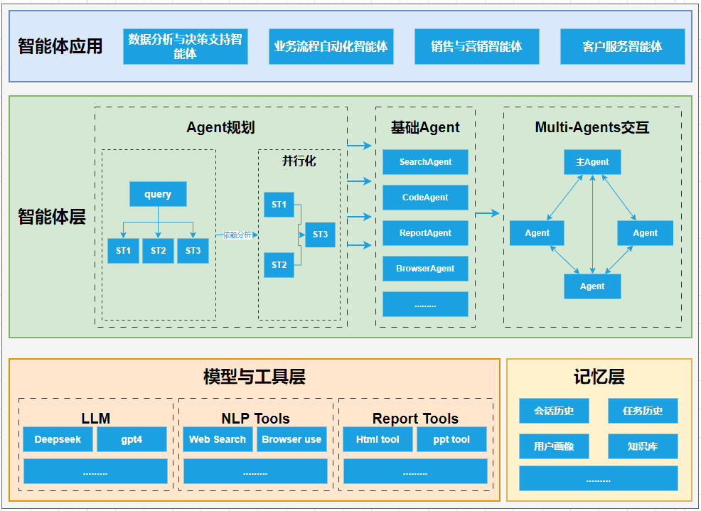 - 六大模块:感知、决策、执行、记忆、反馈优化等完整技术架构;