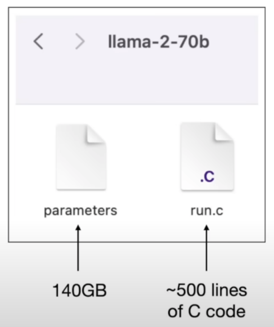 在上面的图像中,parameters 文件是 Meta’s Llama-2-70b model,其大小为140GB,包含70亿个参数(以数字格式表示)。run.c 文件是推理程序,使用这些参数进行模型推理。