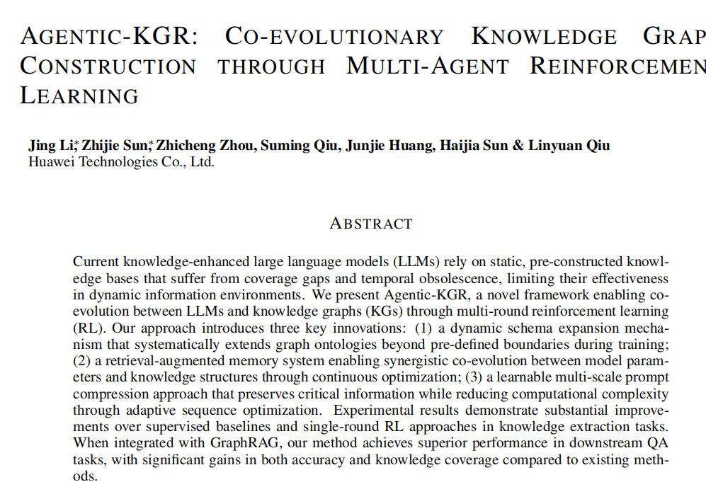 Agentic-KGR框架通过多轮强化学习实现大语言模型与知识图谱共同进化,创新性地引入动态本体扩展、共同进化记忆架构和多尺度提示压缩机制。该方法在知识抽取任务提升33.3分,问答任务提升12.8分,为构建自我进化的知识系统开辟新范式,显著降低幻觉并提高时效性。