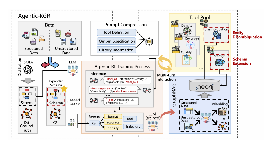 Agentic-KGR框架通过多轮强化学习实现了语言模型与动态知识图谱的共同进化,代表了知识增强AI系统的重要突破。该框架通过动态本体扩展、检索增强记忆系统和可学习的多尺度提示压缩三大创新,在知识抽取任务上相比现有方法提升33.3分,在问答任务上提升12.8分。