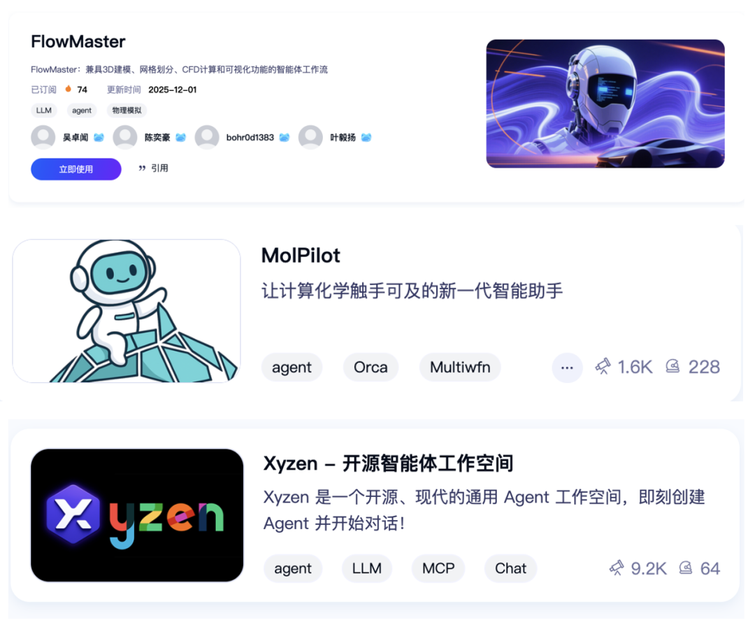 那么下一代的科研成果,可能不再只是论文或模型,而是能被人调用、在真实场景中发挥效能且可持续演化的科研智能体。要走到这一步,我们最需要的是一个舞台:让一个 Agent 有机会被成百上千次调用,被看见、被认可、被放大,慢慢变成科研生涯或职业道路上的真实资产。