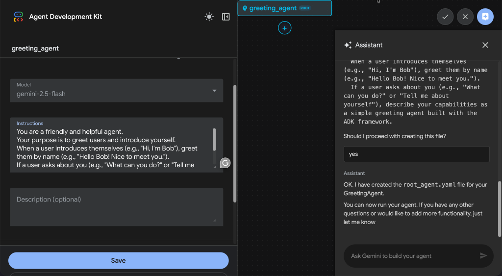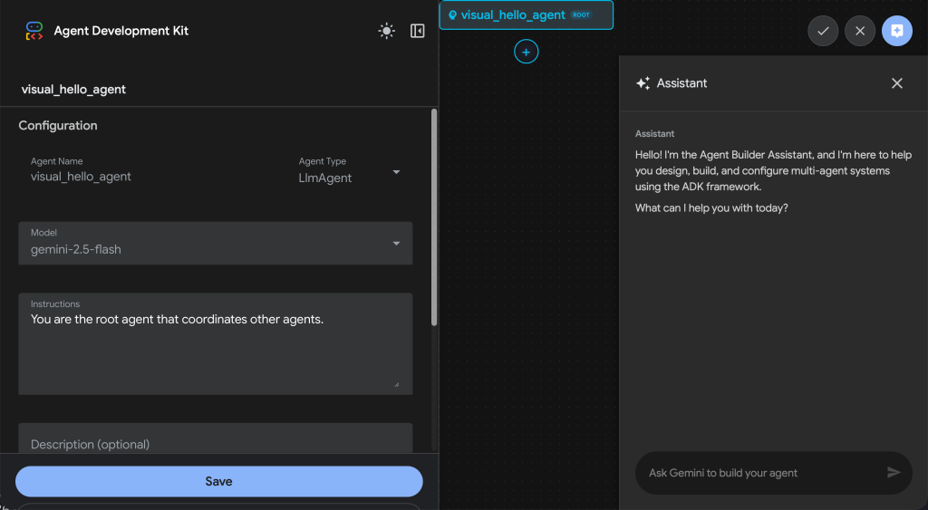 可视化代理构建器 (GUI): Visual Agent Builder 在 ADK v1.18.0 中推出,是一个基于浏览器的 IDE,它结合了可视化工作流设计器、配置面板和 AI 助手。您可以通过拖放交互和自然语言对话设计多代理系统,该工具会在幕后生成正确的 YAML 配置。